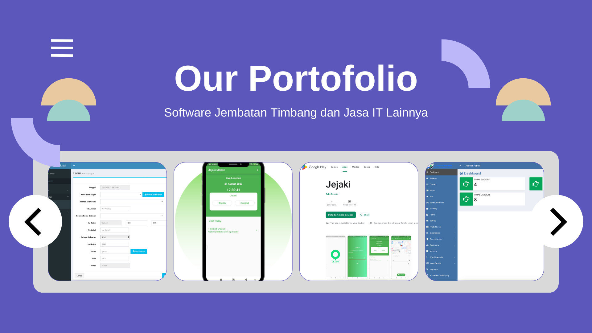 Kami melayani jasa pembuatan software custom sesuai kebutuhan perusahan anda. seperti software jembatan timbang, software absensi, hrms, project dll. Berbasis web dan mobile android ios